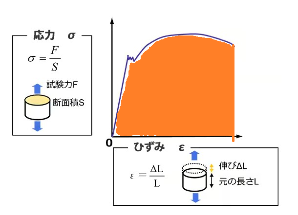 この靭性は、応力-ひずみ線図においては、グラフの積分値という形で表現されます。