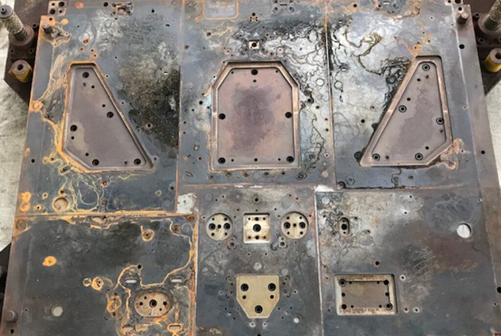 金型の改造 農業機械メーカー 設計変更に伴う、カットピアス型のピアス位置の変更の改造です。金型サイズはRL950 x FB840 x DH450。金型設計図無しの案件でした。 前の記事へ 一覧へ戻る 次の記事へ
