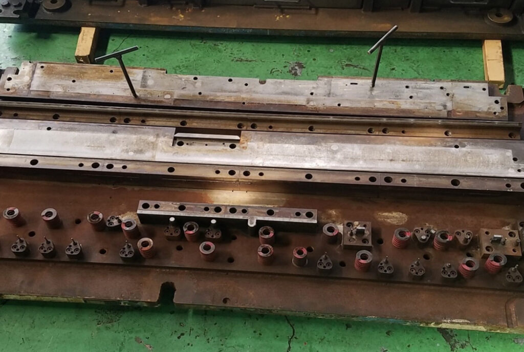 カット+ベンド型の修理です。破損した金型です。下型に倣い、上型をベースから修理しました。金型サイズはRL2100 x FB900 x DH450。金型設計図無しの案件でした。