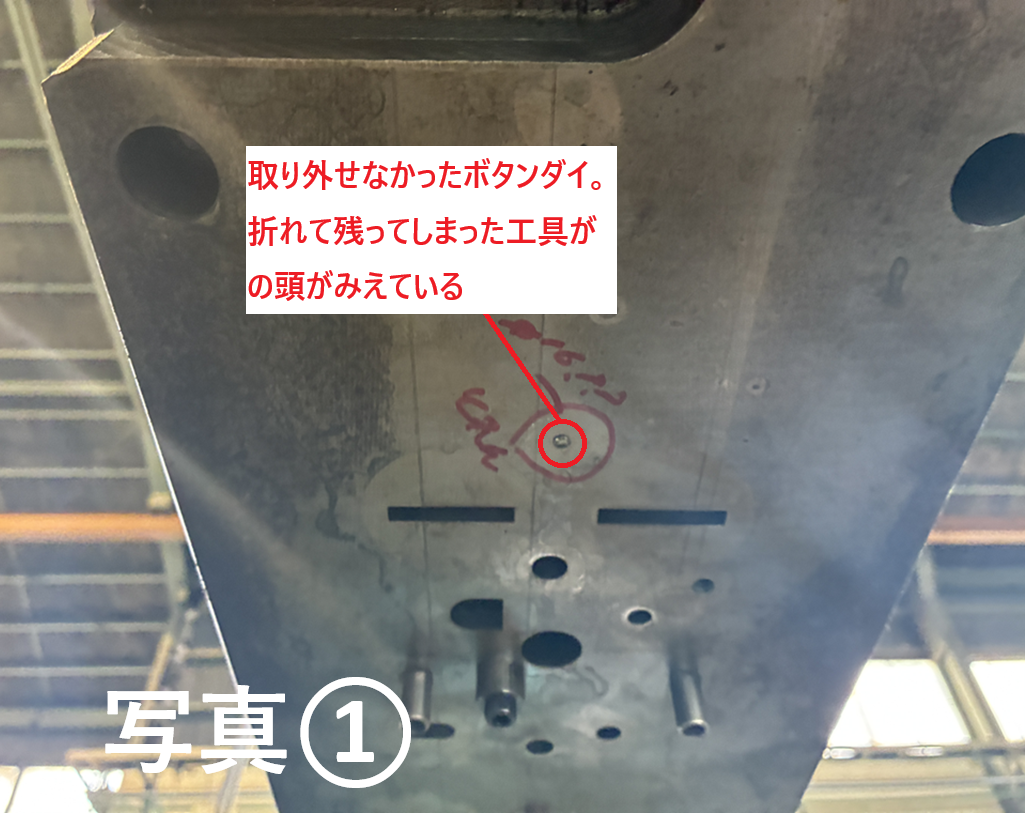 (写真①の金型に赤丸で示されてるところが該当のボタンダイの部分、穴からのぞいているのは、ボタンダイを取り外そうとして中に残ってしまった工具)