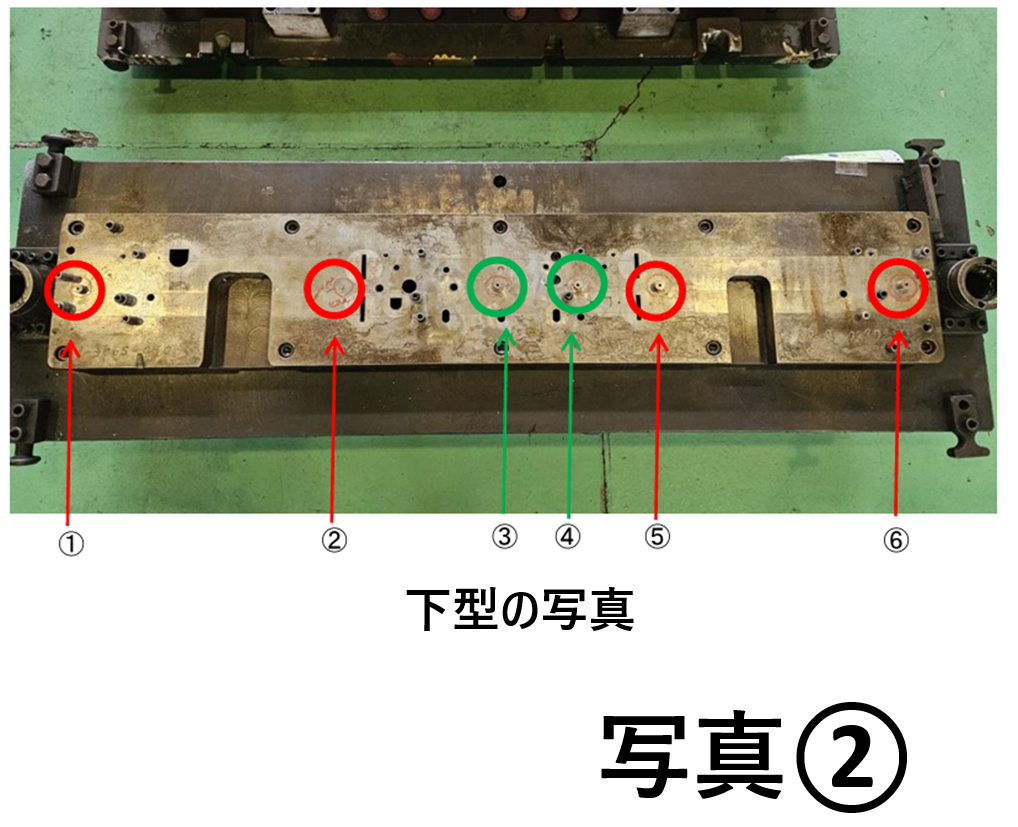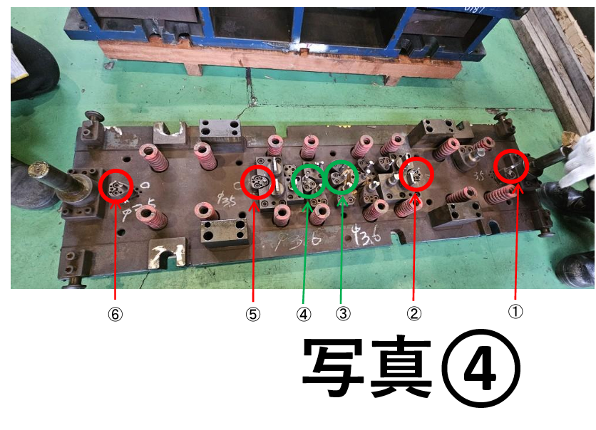 下型においてボタンダイ径の変更を行った箇所(①・③など)については、上型側とのクリアランス調整が必要となるため、刃合わせを実施しました。