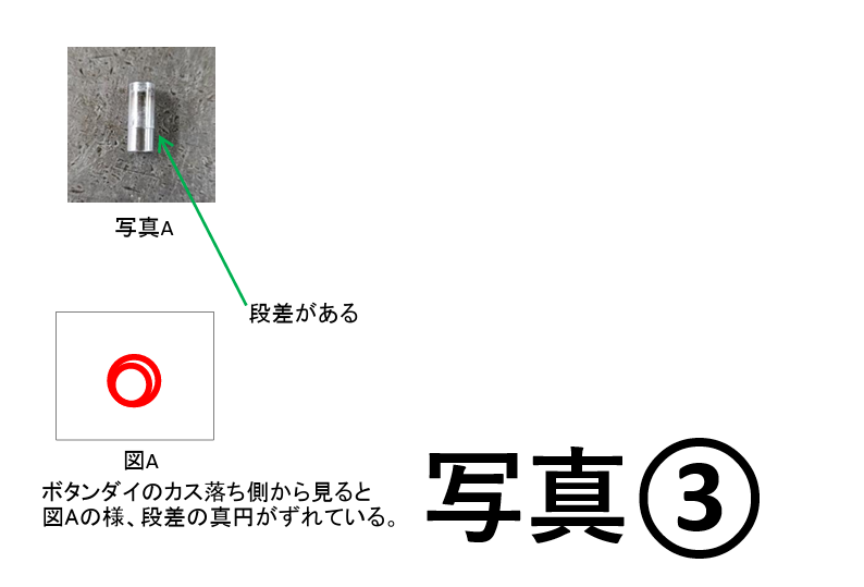 取り外したボタンダイは段付きの異形状となっており(写真③参照)、既製品の使用ができない状態でした。